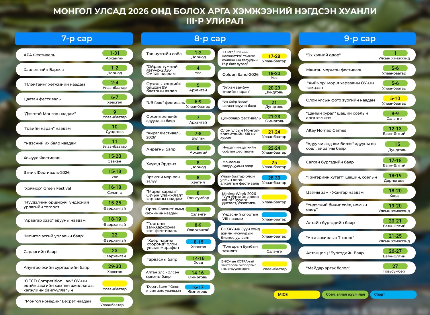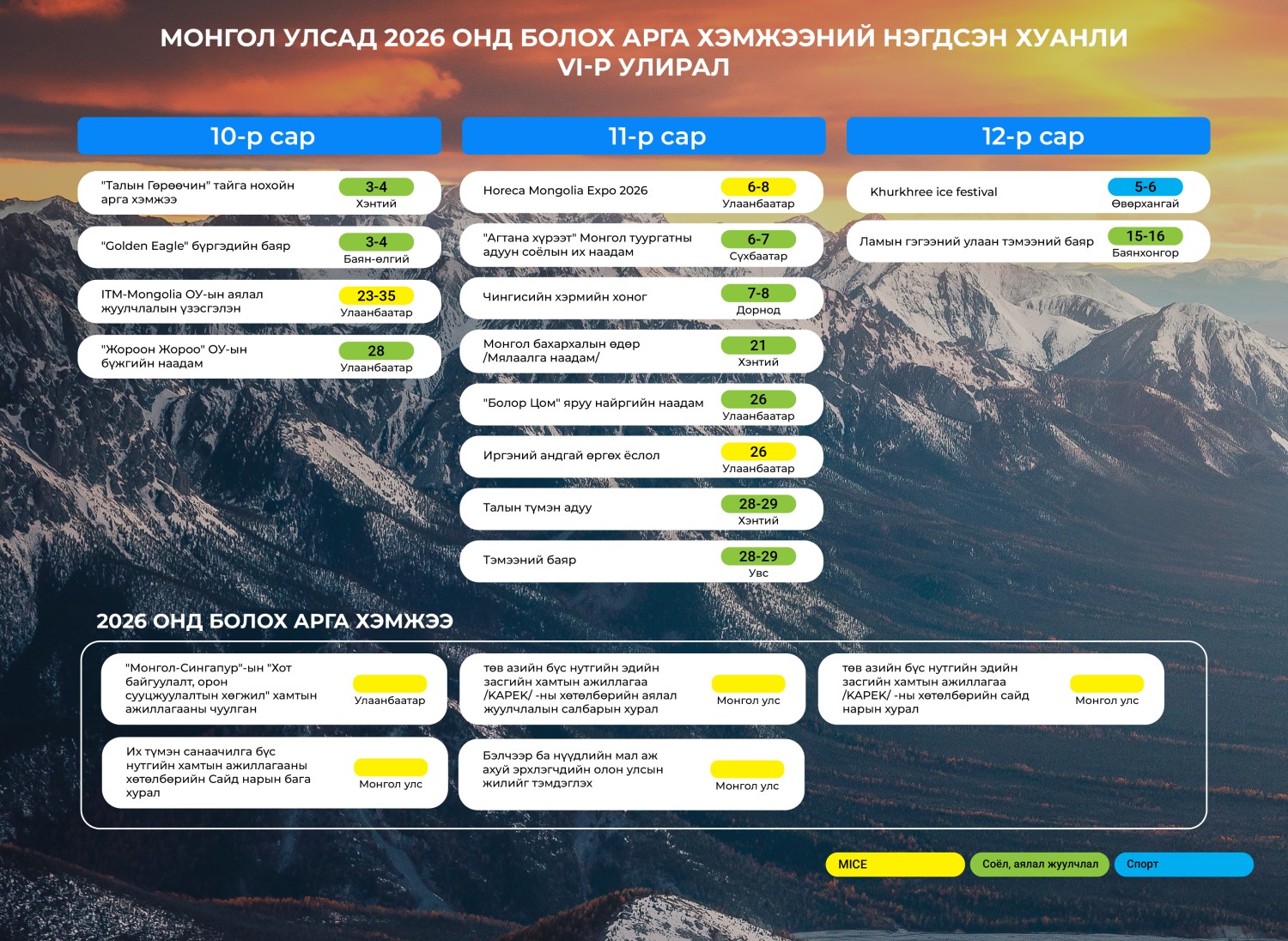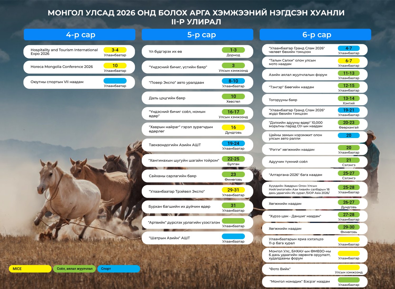 Нэгдсэн цаглаварт 2026 онд нийт 140 томоохон арга хэмжээ зохион байгуулахаар төлөвлөсний дотор соёл болон аялал жуулчлалын 99, спортын 14 арга хэмжээ багтаж байна. Мөн олон улсын хурал, зөвлөгөөн, үзэсгэлэн буюу MICE аялал жуулчлалын чиглэлээр 27 эвент зохион байгуулахаар боллоо.