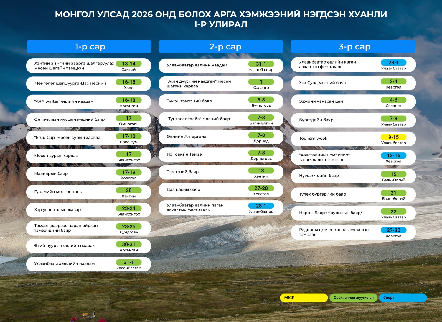 2026 онд улс орон даяар зохион байгуулагдах соёл, аялал жуулчлал, спортын үйл ажиллагааны нэгдсэн цаглавар батлагджээ.