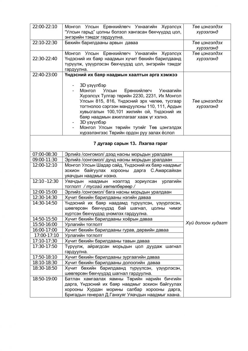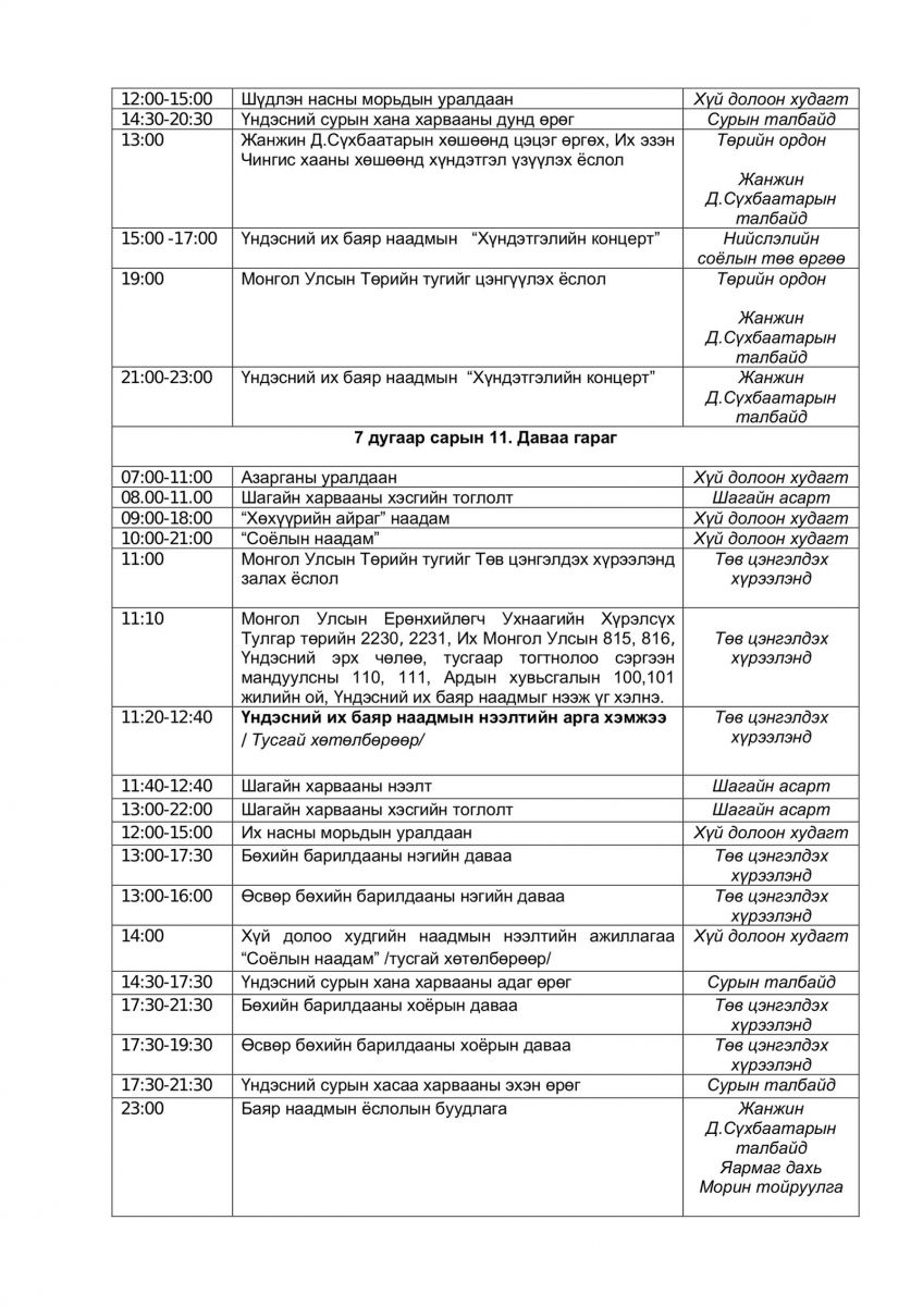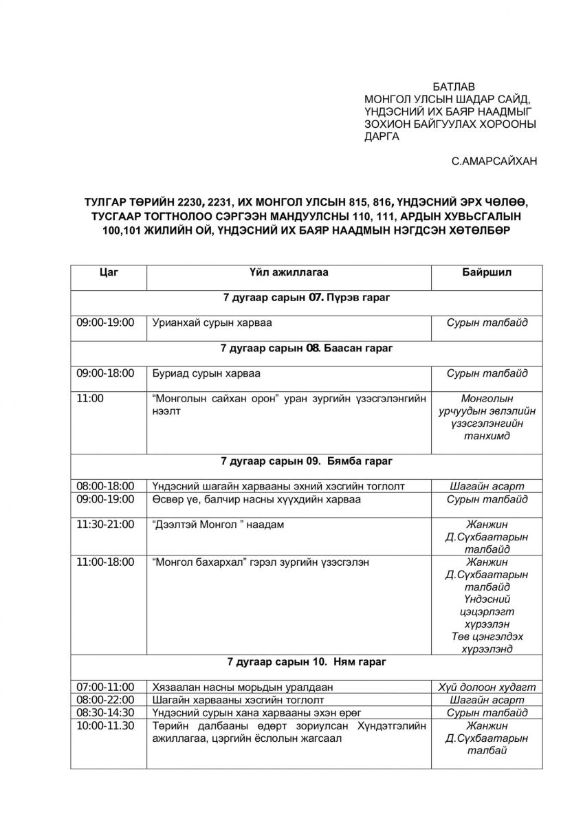 Тулгар төрийн 2230, 2231, Их Монгол Улсын 815, 816, Үндэсний эрх чөлөө, тусгаар тогтнолоо сэргээн мандуулсны 110, 111, Ардын хувьсгалын 100, 101 жилийн ой, Үндэсний их баяр наадмын хөтөлбөрийг бүрэн эхээр нь хүргэж байна.