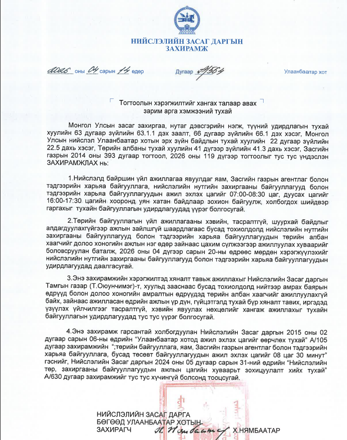 Мөн төрийн байгууллагын үйл ажиллагааны хэвийн, тасралтгүй, шуурхай байдлыг алдагдуулахгүйгээр ажлын зайлшгүй шаардлагаас бусад тохиолдолд нийслэлийн төр, захиргааны байгууллагын албан хаагчид 2026 оны 4 дүгээр сарын 20-ны өдрөөс долоо хоногийн нэг өдөр зайнаас цахимаар ажиллана.